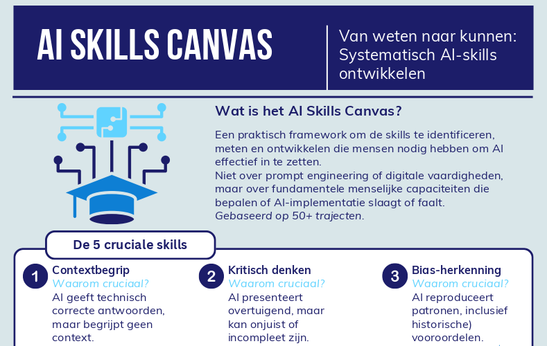 Een assessment wordt vaak een theater van vragenlijsten die niemand eerlijk invult, zelfbeoordelingen die te rooskleurig of te negatief zijn, en Excel sheets waar niemand meer naar kijkt. Assessment is geen doel. Het is een startpunt. Het AI Skills Canvas helpt je de 5 cruciale vaardigheden te identificeren, meten en ontwikkelen die bepalen of AI-implementatie slaagt of faalt. Gebaseerd op 50+ trajecten, bruikbaar voor individuele zelfreflectie tot organisatiebrede programma’s.